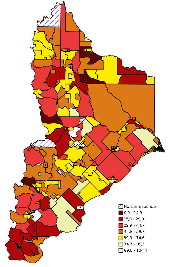 Los hogares con Necesidades Básicas Insatisfechas (NBI) son los hogares que presentan al menos uno de los siguientes indicadores de privación: 1- Hacinamiento: Hogares que tuvieran más de tres personas por cuarto. 2- Vivienda: Hogares en una vivienda de tipo inconveniente (pieza de inquilinato, vivienda precaria u otro tipo, lo que excluye casa, departamento y rancho). 3- Condiciones sanitarias: Hogares que no tuvieran ningún tipo de retrete. 4- Asistencia escolar: Hogares que tuvieran algún niño en edad escolar (6 a 12 años) que no asistiera a la escuela. 5- Capacidad de subsistencia: Hogares que tuvieran cuatro o más personas por miembro ocupado y, además, cuyo jefe no haya completado tercer grado de escolaridad primaria.